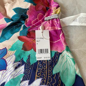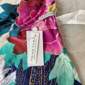 A metal ring accessorizes a colorful printed halter tankini top from Trina Turk.