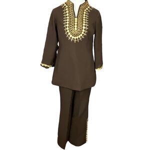 60’s/ 70’s Brown and Gold Tunic and Pants Suit Ornate Gold Trim S/M