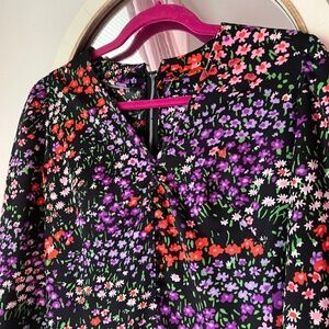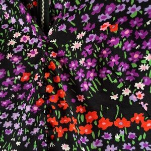 Late 60s / early 70s black fit & flare style mini dress with a tiny purple & red psychedelic floral print.
