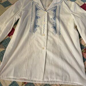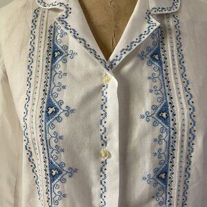 šµBeautiful vintage Greek style button up blouse with lovely needlepoint details throughout the bodice, lapel, and sleeves. Sleeves taper beautifully down to the wrist and have dart details throughout to give it a fitted slender shape. Made of a beautiful cotton blend and is super comfy and breathable. Just the right amount of sheer.