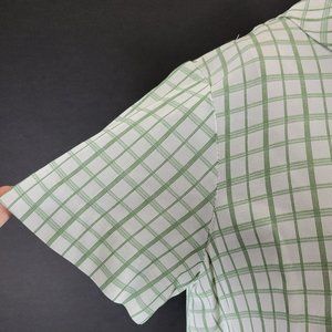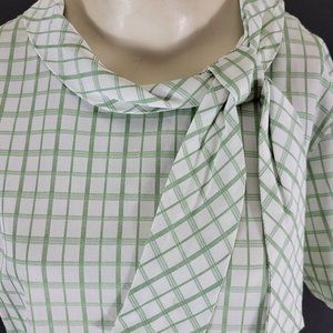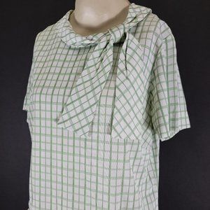1960s Vintage Short Sleeve Grid Check Shift House/Lounge Dress Small Cowl Neckline With Side Bow-Front Pockets-Back Metal Zipper And Hook Eye Fastener-ILGWU Union Made Label-No Size/Fiber Content