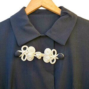 60s Black Dress Linen Wrap Soutache Ribbon Frog Buttons Union Label Size 8