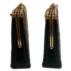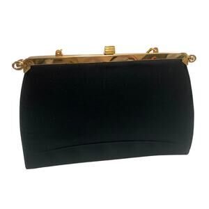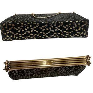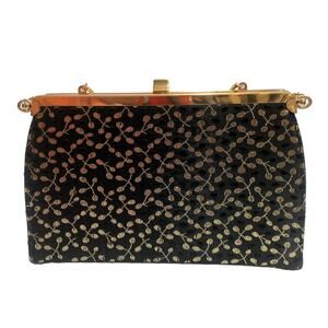 True vintage 60s era convertible bag with chain strap. Black with gold and black leaf pattern in metallic thread, Black Faille or smooth black with pleat at bottom, you choose. Outer cover is removable and snaps onto bag, flip it over and change the look, remove it and change the look! Features Ideal frame, one interior slip pocket, strap will tuck inside for clutch