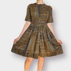 1960s short sleeve dress. Button front closure. High round collar. Pleated fullness in skirt.