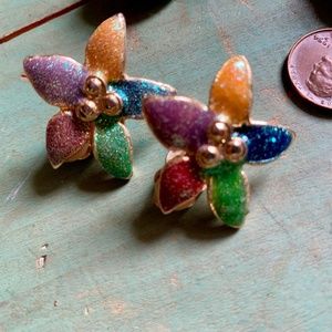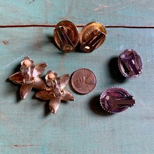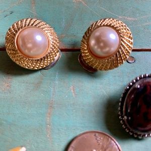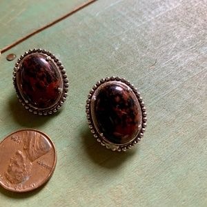 60s Clip On Earrings - Mahogany Obsidian - Enameled - Pearl Mid-Century Modern
