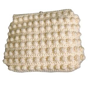1960s Crochet Cord Popcorn Pattern Ivory Cream Color Hand Bag Maxi Clutch Wooden Toggle Purse. Matching rayon crepe lining with one unprotected to losing pocket inside. Crochet loop with wooden toggle closure.