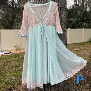 This sexy nightgown set was my Mom's; a surprise from my Dad because she loved Green Acres. Pretty aqua and beige nightgown and cover up. Front tie. V-neck. Sheer. Sexy. Elegant.