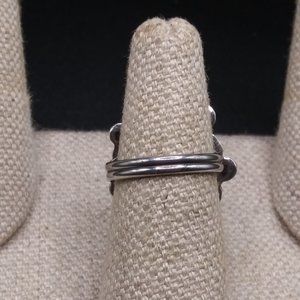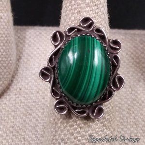 A Nice Multitone Striped Matrix to this Malachite. It is Set in a Sterling Silver Native American Setting. Ring Face is Appx. the Size of a Quarter. Ring Does have an Unidentified Artisan Mark with no Purity Mark. Ring has Been Tested for Purity and Tests Positive for Sterling Silver. Ring is a Sz. 5 with a Total Weight of 7.22g.