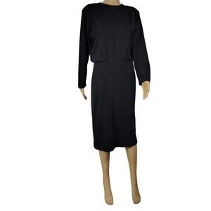 1960s Mod MCM Black Long Sleeve High Neck Pencil Skirt Dress Back Buttons Shoulder Pads. Buttons n back and zips at the waist with eye & hook closure. Dolman long sleeves with pleats on the shoulders. Split in back.