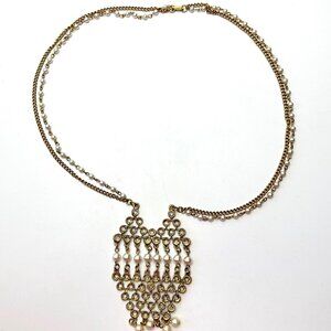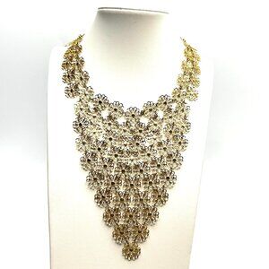 It's a neck party! This dynamic layering duo captures the futuristic glamour of the Space Age! Worn together, these complementary vintage pieces create a stunning statement—the architectural openwork pendant with its geometric crosswork and pearls beautifully contrasts with the cascading gold-tone mesh bib. Layer them for maximum impact or wear separately for versatile styling.