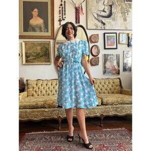 60s Rockabilly Blue and White Floral Dress w Belt Size Size Medium
