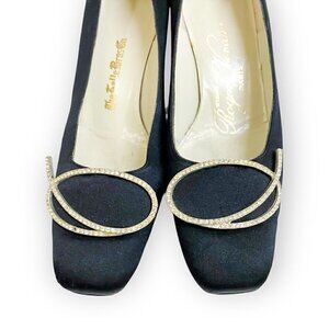 vintage Roger Vivier black satin pumps with large ornaments in rhinestone with silver tone cases.