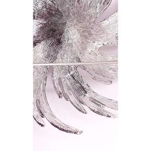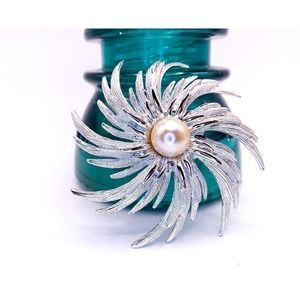 Sarah Coventry Silver-Tone Swirl Brooch was introduced in 1969. This striking brooch features a large faux pearl center with a swirl of textured and polished silver-tone metal (Rhodium) curving to form a sunburst or hurricane effect. The brooch is appropriately 2½” in diameter. Marked SARAHCOV