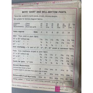 Vintage sewing pattern Simplicity 8173 features a boys' shirt with a stand-up collar, patch pockets, front button closure, and matching bell-bottom pants with elastic waistband. Signs of previous use.