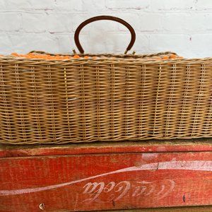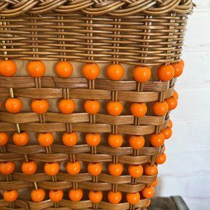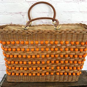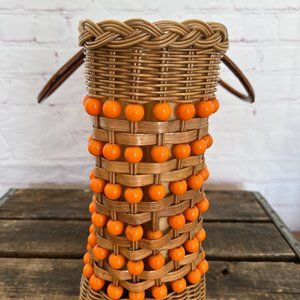 Straw coated in plastic with large orange plastic beads surrounding the whole purse