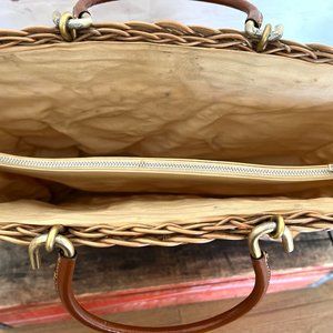 60's Straw & Beaded Tote Bag/Purse - Leather Handle - Boho - Mod - Coated Straw