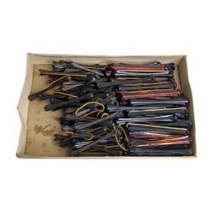 Rubber bands, as expected have degraded. There are rubber band pieces stuck to a few items, but they seem to come off fairly easily with finger nails. Many rubber bands are in tact, but expect they need to be replaced. One end of the box is in rough shape. Please see photos.