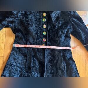 This is a gorgeous 1960s vintage coat. Made of a black velvet, it’s a princess style coat with a fitted top and full bottom. It buttons down the front with huge green rhinestone buttons - these are not original but are fantastic. The coat only buttons down to the waist - there are 7 buttons Coat has no tags. It has a very 90s/ Y2K betsey johnson vibe as well. Overall in good vintage condition with no major flaws to note - because the buttons are not original, they move around a little (see last pic) but this isnt noticable when the coat is buttoned. Has no size tags - measurements in line with a small.