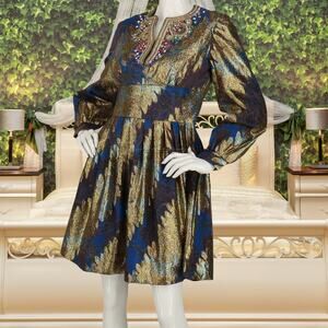 Step into the elegance of the 60s with this Pat Sandler gold metallic dress. Adorned with intricate beading, it's a statement piece for any evening. The shimmering fabric and vibrant accents bring a touch of glamour and sophistication. Capture these moods: glamorous, sophisticated, vintage charm, statement piece, vibrant, elegant, luxurious, intricate design, bold, classic, refined, timeless, sparkling, dazzling, exquisite