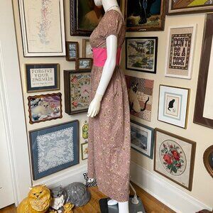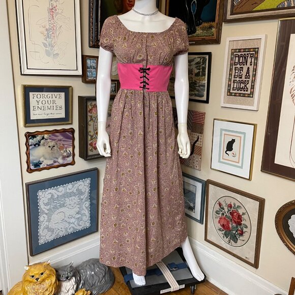 Add a retro touch to your wardrobe with this 60s Vintage Pink and Black Floral Cotton Corset Waist Scoop Neck Peasant Dress from Vintage. Crafted from cotton in size S, the dress exudes feminine charm with its corset waist and floral design.
