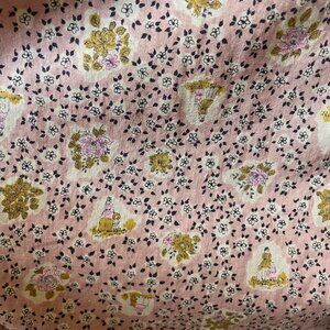 • No tags, but the selvage edge says "A Regulated Cotton Never Misbehaves" The print includes the word, "American" and is a ditzy floral with figures of a woman and child.
