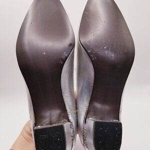Gorgeous silver lame leather mary jane with faux alligator toe and heel cup detail. Triple strap, leather is a little stiff, but shoe is in excellent overall condition. Marked a size 5 1/2, measured 8 3/4" from toe to heel inside.