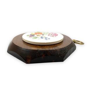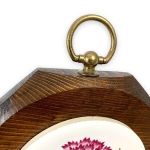 1960's handcrafted JERRY SCHULTZ floral garden tile on pine wood art wall hanging. Hand made in New York, USA. Beautiful flowers painted on white tile and fastened on a pine wood octagon block. Brass knob on top. Measures 5.5" x 5.5" x 1". Excellent vintage condition!