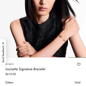 The enchanting Louisette Signature bracelet modernizes two of the House’s best-known emblems with a glint of eye-catching radiance. Its open design, crafted in gleaming gold-finish metal, pairs the LV Initials with a pointed Monogram Flower enhanced by a sparkling crystal in the center. An on-trend bracelet that emanates feminine elegance.