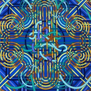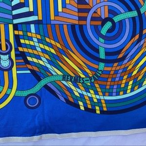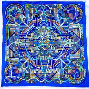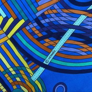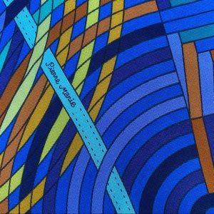 Absolutely beautiful and vibrant 90cm square scarf from Hermès, in 100% silk stretchy jersey fabric by artist Pierre Marie. Les Fabrique des rubans abstract blue and orange. Rare style!