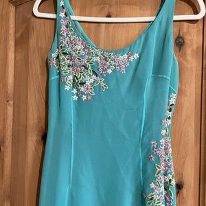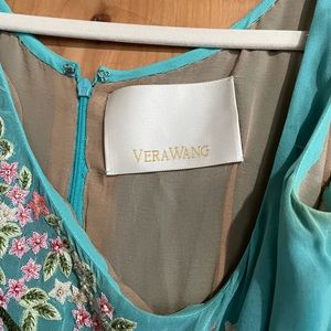 Vintage 90s Vera Wang Blue Gown with Pink flower embroidery, zip up back. Silk chiffon material. Says size 6 but fits more like 2