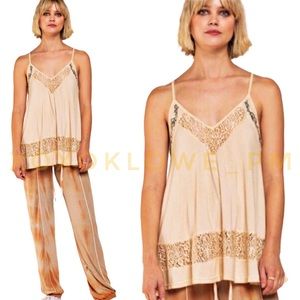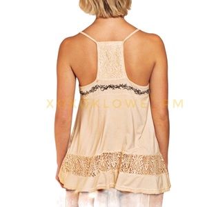 This sassy buttery soft golden sand lace detail racerback flowy cami tank top is perfect any time of the year. Layer it under a blazer or cardigan, over a baby tee or wear it alone for max boho sex appeal.