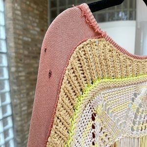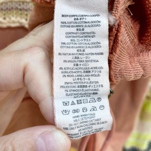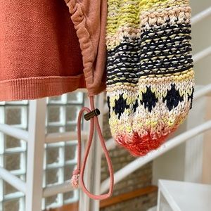 Free People has outdone itself with this sweater design! It’s so unique, creative & cool. Oversized so could fit a S-L. Looks cute worn off the shoulder. 100% cotton except for the colorful crochet. Deep v cut, unfinished edges, drawcord adjustable hem. 24” long (front), 31” long (back). 22” bust (laying flat across). 34” long sleeves (measured from neckline). Please note the 2 small holes on the back left shoulder (priced accordingly). Model photos found online, but all other images are my own.