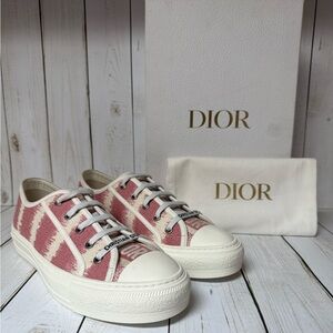 OFF-WHITE Women’s Vulcanized Low Top Sneaker In Black Multi. Sz 40 (please know sizing for brand and style when considering). Colorful flowers pop against checkerboard patterning on a low-top sneaker sporting a signature marbled zip-tie tag and a diagonally striped vulcanized sole. Quotes at the suede heel tabs end on a clever note. New Unworn and In Box.