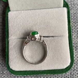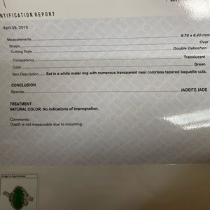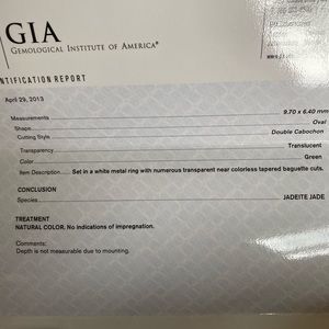 The center stone of this ring is an old mined Jadeite jade, the jadeite was originally from a vintage necklace pedant from my grandmother, my aunt made it into a ring and had the ring certified by Gemological institute of America back in 2013. Top color, the gem is all natural, no indications of impregnation. GIA certification included and will go through Posh!