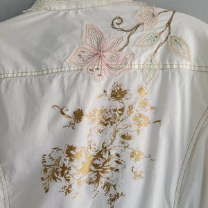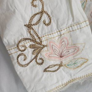 White with beautiful colored embroidery and stitching throughout. Only worn once. Runs small.