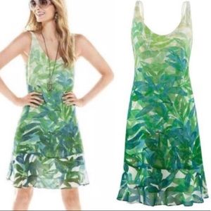 Escape to an island paradise in this airy, easy-to-wear dress featuring double layers of chiffon in a tropical print. The scoop neck flatters and frames your face, while the flounced hem adds flirtatious volume to the sleek design. Adjustable straps, lined, polyester, machine washable and imported. Approximate measurements: 17.5” pit to pit, 35” length, & 18” waist.