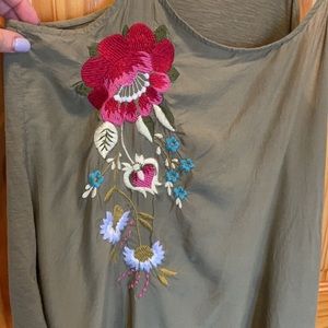 Super cute looks like 3-D floral embroidery detail, on military green tone, low round neck, Spaghetti doubled straps Not adjustable.