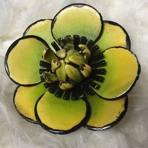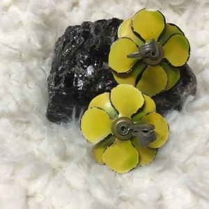 Preowned Vintage 60’s 3D Enamel Flower Clip Earrings. Very cute and will brighten up any outfit. Purchased AS IS from an Estate Sale. VGUC for age but enamel does show slight wear (see pics) not noticeable when worn. Colors are bright yellow, green, and black. Clips close properly. From NS home. See pics for details.