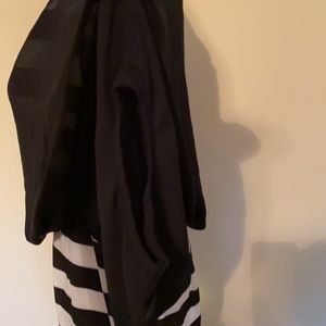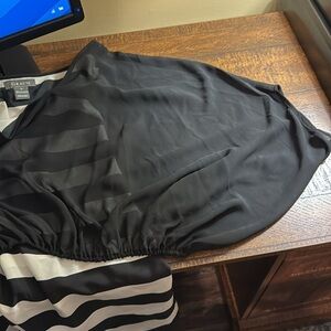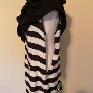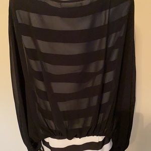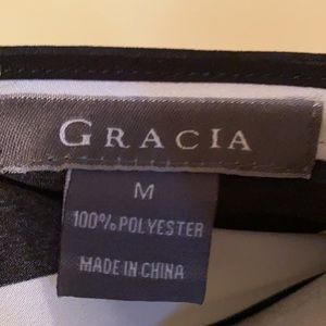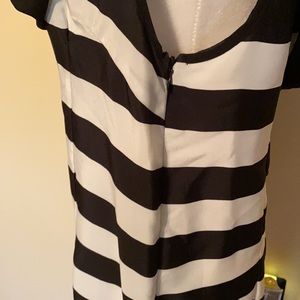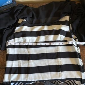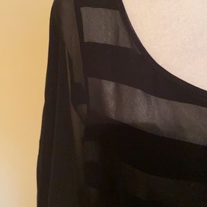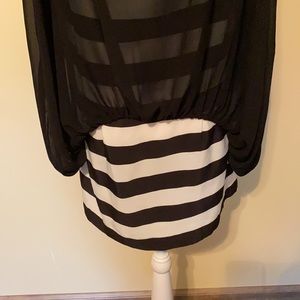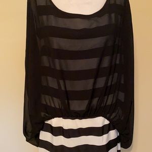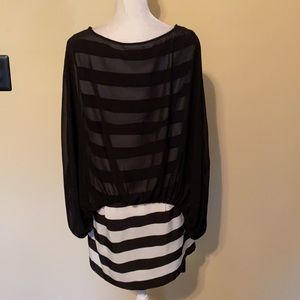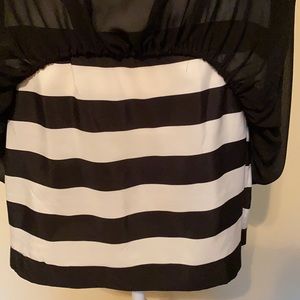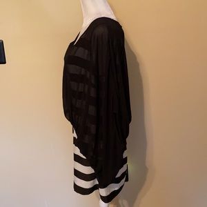 Ladies medium Gracia top, two layers, sheer black layer over top of black and white horizontal striped layer, lightweight 100% polyester, tunic length with side zipper on striped under layer, short sleeve, excellent condition