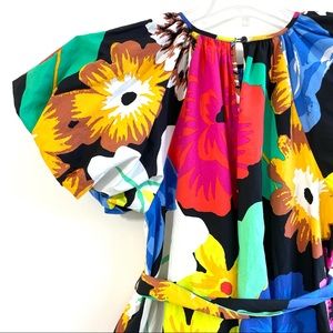 Short-sleeve maxi dress with high-low hemline lends a lovely silhouette. Polished poplin construction with allover florals for a bold yet classic look. Keyhole back with button closure offers a sleek finish. Self-tie belt brings extra shaping to fullness of skirt.