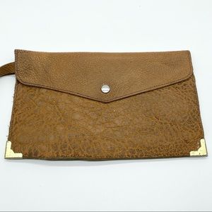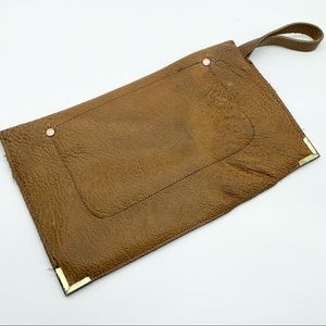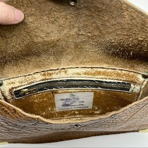 Beautiful Vintage handmade leather clutch by the Leather Hand in Nashville! Super thick leather that’s extremely durable! Classic design with brass and copper hardware. Snap closure. Strap for your wrist. Unlined interior. Talon zipper! Some wear as expected with the age. Lovely piece!