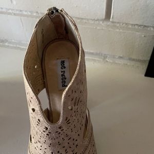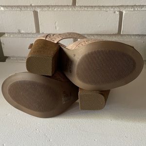Super cute chunky heels. Heel height about 3 inches but chunky style heel so comfortable to wear and walk in. Has feminine cut outs and detailing. Zipper back makes it easy on/off.