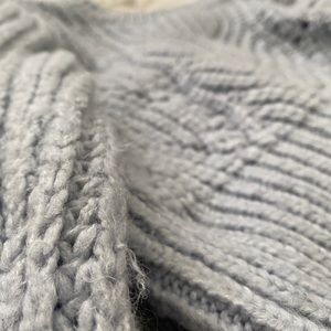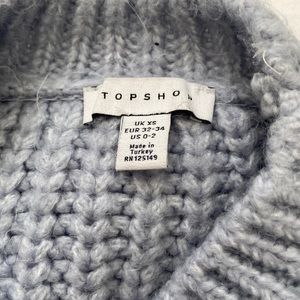 chunky knit cropped jumper by topshop. this is from before they were bought by asos. very soft and comfortable, a nice powder blue color. it has poufy sleeves, almost like a balloon sleeve but much more structured, giving a bit of shape by the shoulders.