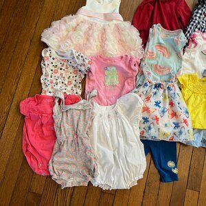 19 piece bundle of girl's clothes. Several coordinating outfits, dresses, onesies, rompers, tunics. Butterflies, Lemons, Watermelon, Frog, Roses, etc. Various brands. Excellent condition. American princess, Gymboree, Carters, etc.