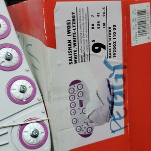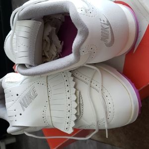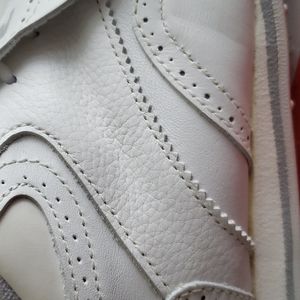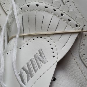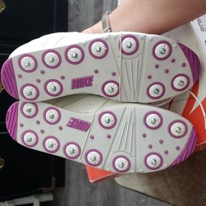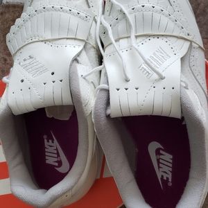 All leather! Winged tipped, classic style women's golf shoes with a pop of orchid purple color as you stroll the fairways. Supportive arch interior. Never laced. Never worn. Bands never taken off the detachable kilties. Beautiful details. Both smooth and grained leather with precise stitching and cutouts with the NIKE brand monogrammed on the kiltie covers. Spikes are all brand new never walked on. Pristine condition! 10/10
