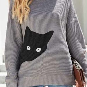 This chic grey ribbed knit turtleneck finds some whimsy with a friendly feline graphic peaking around the side