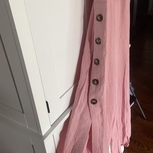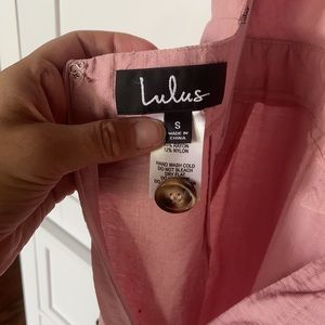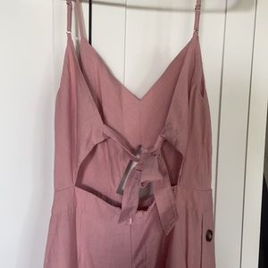 Cute lulus romper (?) not sure if that’s how this would be classified. Open middle upper abs, buttons along the side/side of leg. Wide leg, cropped, linen material. Tie in back, adjustable straps. Will likely be wrinkled, sorry.