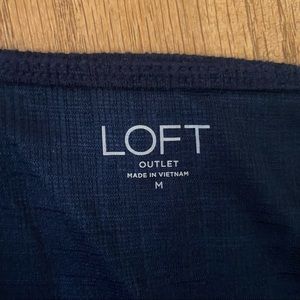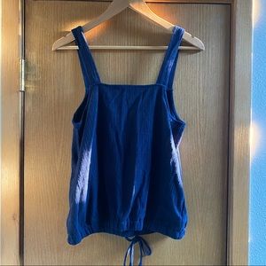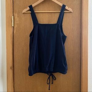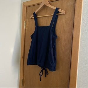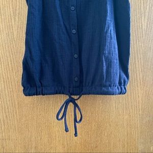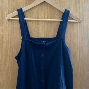 Dark navy blue top from Loft. Thick straps, square neckline with a cute cinched elasticized tie waist. Buttons are decorative, not functional. Very good used condition, no noted flaws or damage. Fabric has a nice texture to it! Cute and classy for spring or summer!