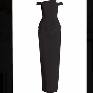 Elegant shoulder-baring gown with an asymmetric tiered peplum.