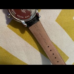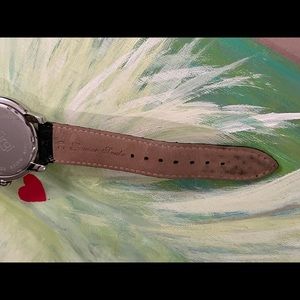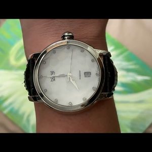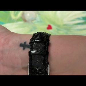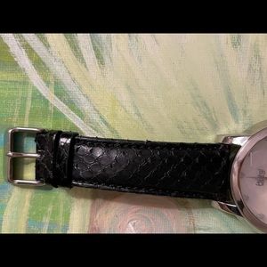 Still has plastic on back. Beautiful condition, black genuine snake skin band with large diamond face and little diamonds around inside dial. Very classy. (Needs new battery) box not included unless I find it! 9.5 inches